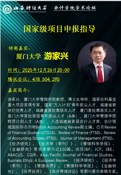 为切实提升我院科研骨干国家基金项目申报质量,2025年12月26日晚上,我院特别邀请厦门大学游家兴教授担任指导专家,我院科研骨干教师围绕相关学术研究主题与国家项目申报核心要点,展开深度研讨。