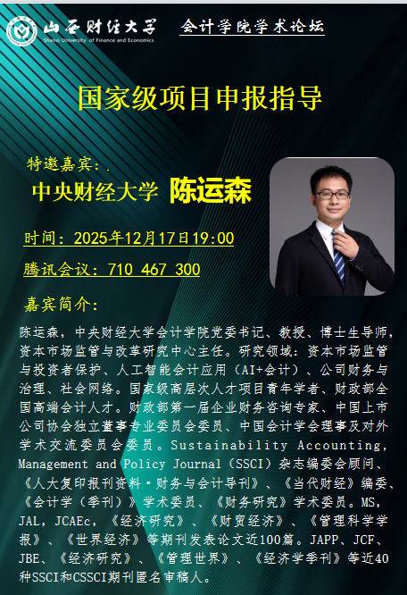 为切实提升我院科研骨干国家基金项目申报质量,12月17日晚上,学院特别邀请中央财经大学会计学院博士生导师陈运森教授担任指导专家,我院科研骨干教师围绕相关学术研究主题与国家项目申报核心要点,展开深度研讨。